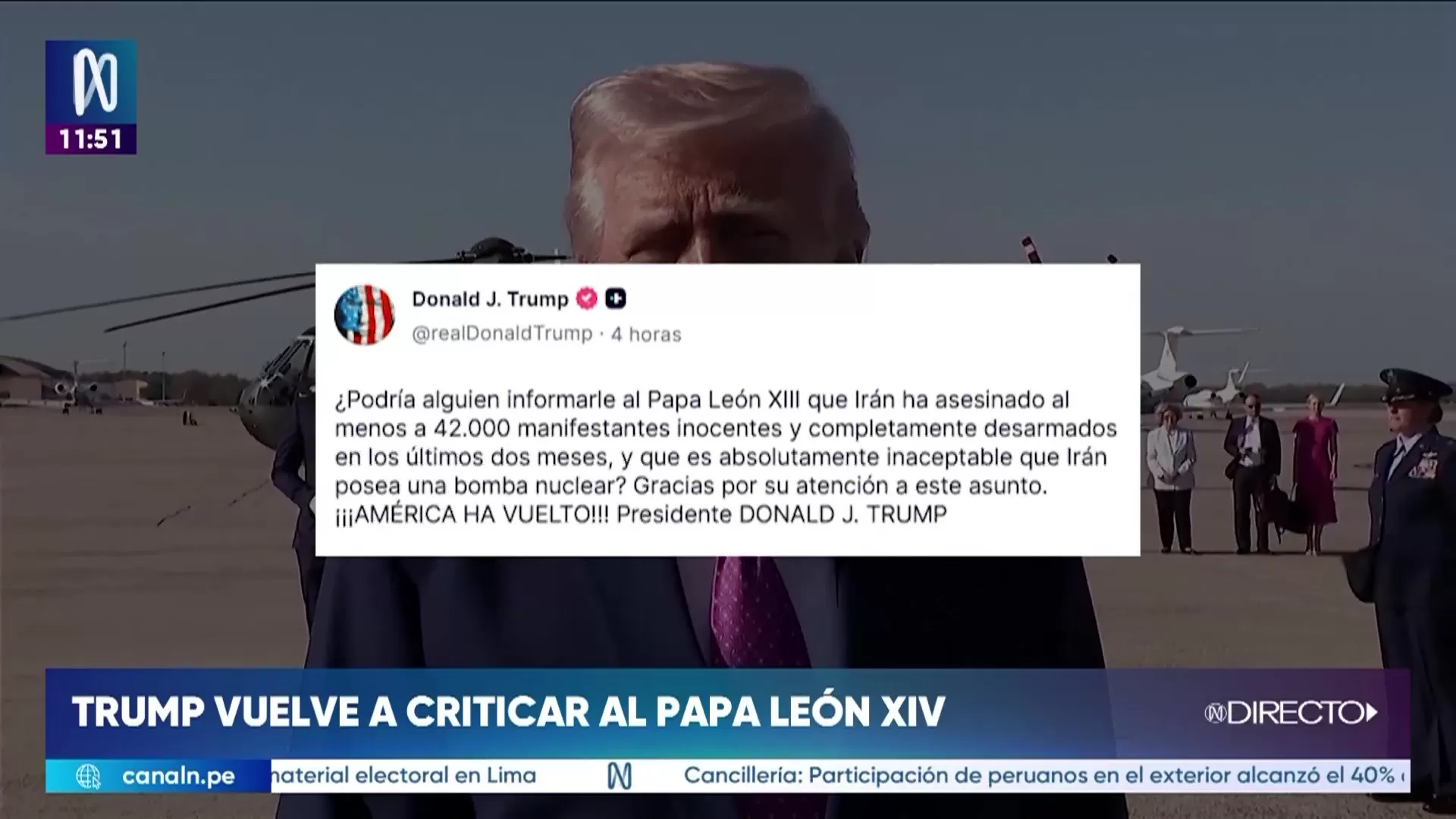 Donald Trump volvió a criticar al papa León XIV por su postura frente a la guerra en Irán, calificándolo de débil en política exterior. El presidente de Estados Unidos exigió que se informe al pontífice sobre el asesinato de 42000 manifestantes en suelo iraní y rechazó que dicho país posea armas nucleares. Por su parte, el santo padre aseguró desde África que no teme a la administración estadounidense y seguirá promoviendo la paz. Líderes internacionales y la Conferencia Episcopal Peruana rechazaron los ataques de Trump, advirtiendo un posible impacto negativo en el voto católico para las elecciones legislativas.