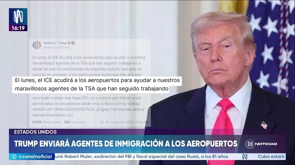 El presidente Donald Trump anunció la medida mediante una publicación en redes sociales, indicando que instruyó a ICE a desplegarse en aeropuertos a partir del lunes. El mandatario señaló que espera la llegada de los agentes y que ya se les ha indicado prepararse para esta operación.