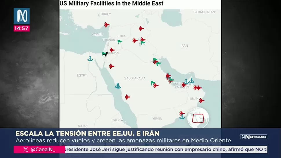 Un mapa difundido muestra que una eventual respuesta iraní podría extenderse a países como Arabia Saudita, Emiratos Árabes Unidos, Omán, Irak y Kuwait, donde se concentran otras bases de EE.UU. La evacuación parcial de Al Udeid en Catar busca reducir riesgos ante una posible escalada.