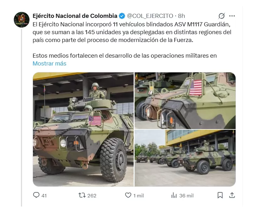 Según informó el Ejército de Colombia a través de su cuenta oficial en X, los 11 vehículos ASV M1117 Guardián se incorporan a las capacidades operativas de la institución.