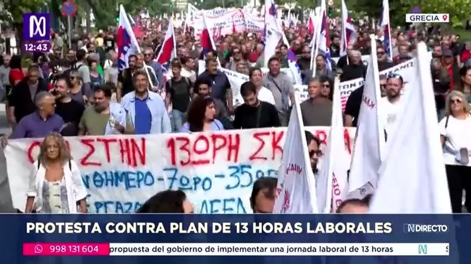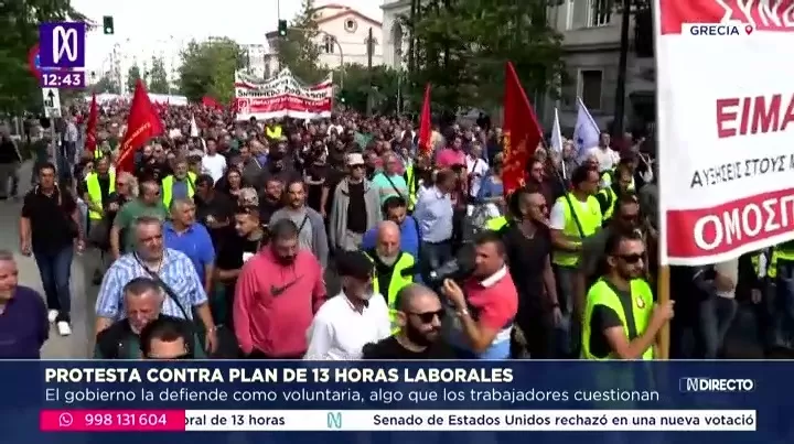 Decenas de miles de personas protestaron en Grecia contra un proyecto de ley que permite ampliar la jornada laboral hasta 13 horas diarias. La huelga general de 24 horas fue convocada por los principales sindicatos del país, paralizando servicios como trenes, barcos y transporte urbano. El Gobierno asegura que la medida es voluntaria y limitada, pero los manifestantes advierten sobre el deterioro de las condiciones laborales. La ministra de Trabajo explicó que el límite semanal de 48 horas se mantendrá. El proyecto será votado en el Parlamento a fines de octubre. Las protestas continuarán si se aprueba.