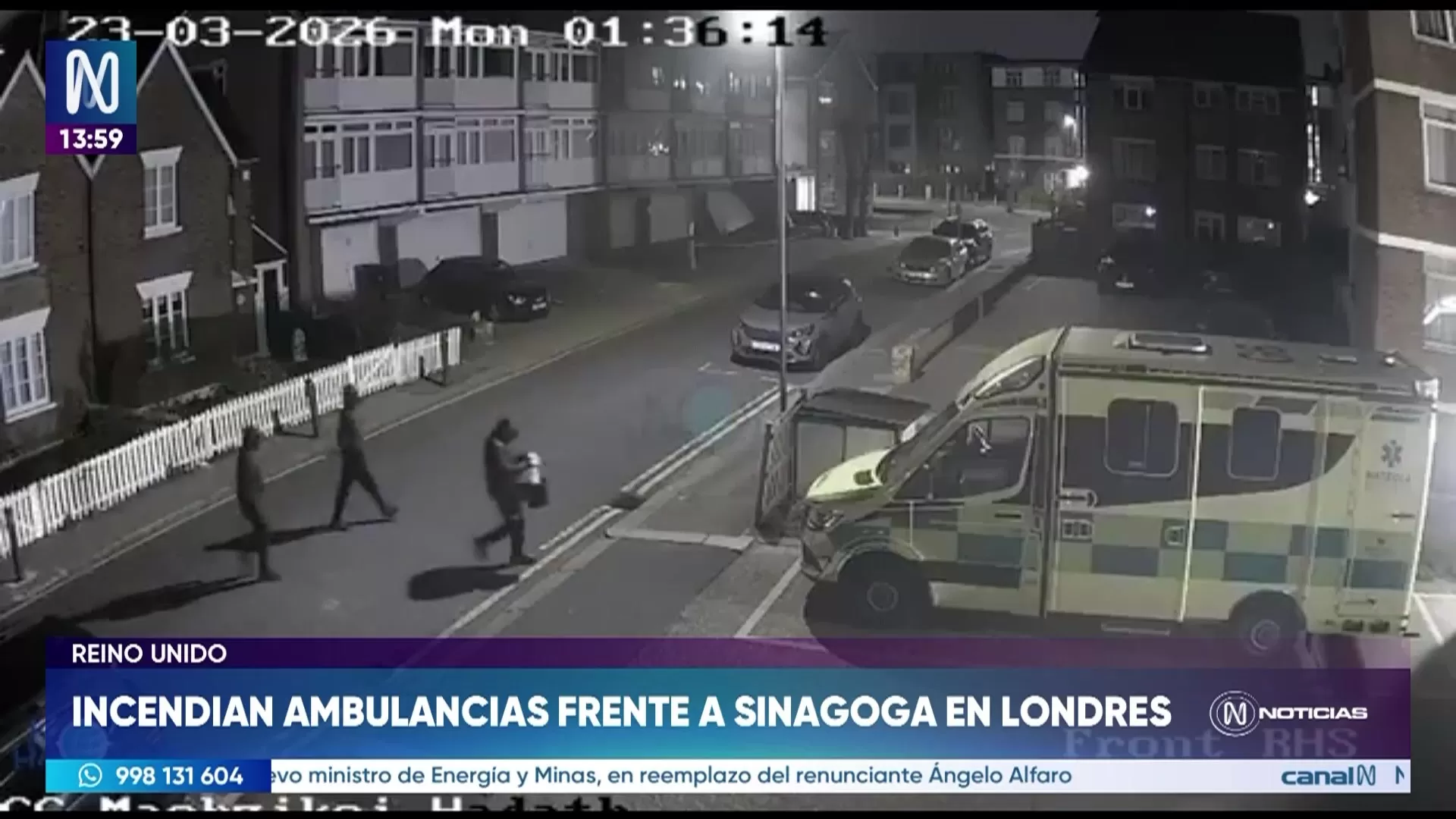 Cuatro ambulancias fueron incendiadas frente a una sinagoga en el norte de Londres, en un hecho que es investigado como delito de odio antisemita. Cámaras de seguridad registraron a tres personas encapuchadas rociando combustible antes de prender fuego a los vehículos. El incendio provocó explosiones por tanques de oxígeno y daños en viviendas cercanas, lo que obligó a evacuar a residentes. La policía busca a los responsables y no ha reportado detenciones. El primer ministro Keir Starmer condenó el ataque y expresó su solidaridad con la comunidad judía afectada.