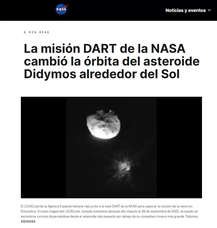 El impacto de la misión DART ocurrió en septiembre de 2022, cuando la nave espacial fue dirigida contra Dimorphos, una pequeña luna del asteroide Didymos. El objetivo del experimento era comprobar si un impacto controlado podía modificar la trayectoria de un cuerpo celeste.
