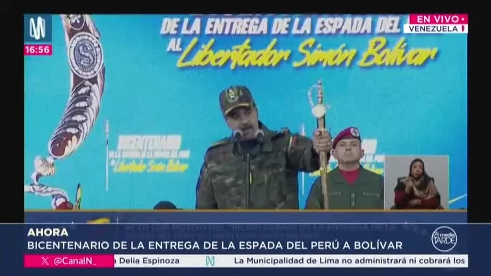 El lider chavista Nicolás Maduro encabezó este martes la ceremonia por el Bicentenario de la Entrega de la Espada del Perú al general Simón Bolívar, realizada en el Patio de las Academias de Fuerte Tiuna, en Caracas.