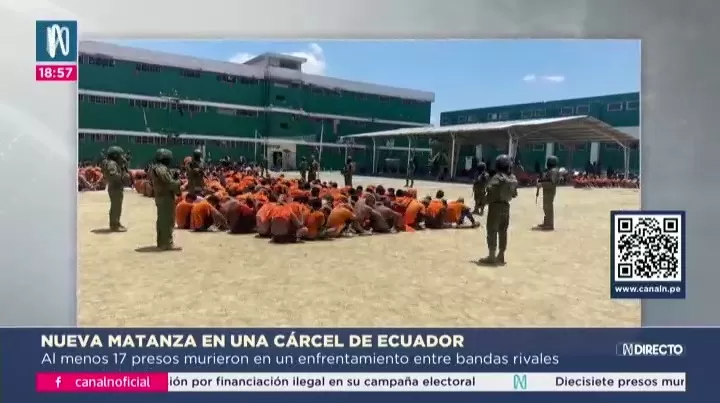La masacre en la cárcel de Esmeraldas dejó 17 muertos entre presos, sumando 30 en tres días tras otro motín en Machala con 13 fallecidos y un guardia. Las autoridades reportaron que se utilizaron armas de fuego y armas blancas durante los enfrentamientos. Imágenes muestran cuerpos ensangrentados e internos desnudos. La situación evidencia el control de bandas criminales dentro de los penales. Desde 2024 los centros penitenciarios están bajo control militar en la estrategia estatal contra el crimen organizado.