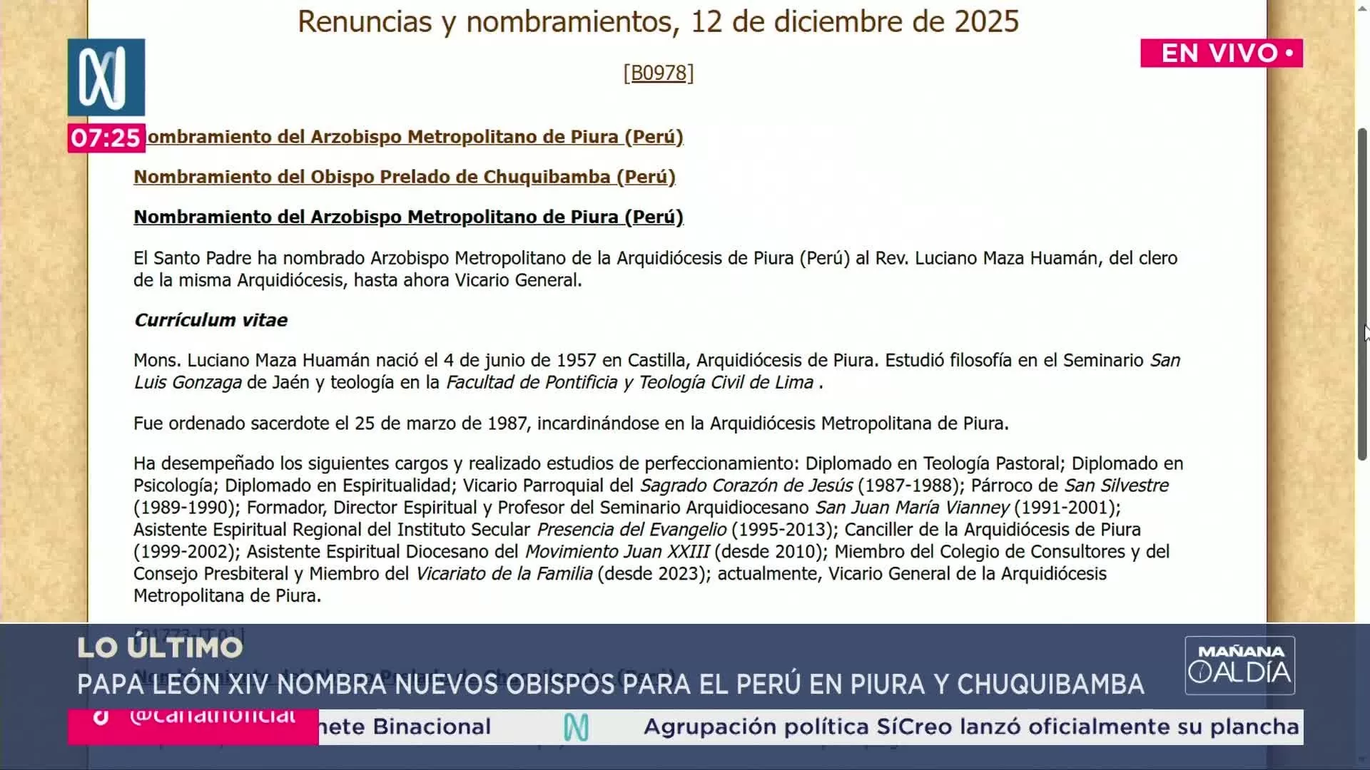 Ambos nombramientos representan un nuevo liderazgo pastoral en regiones claves del país, y fueron anunciados de manera oficial por la Santa Sede, como parte de una renovación en la jerarquía eclesiástica peruana.