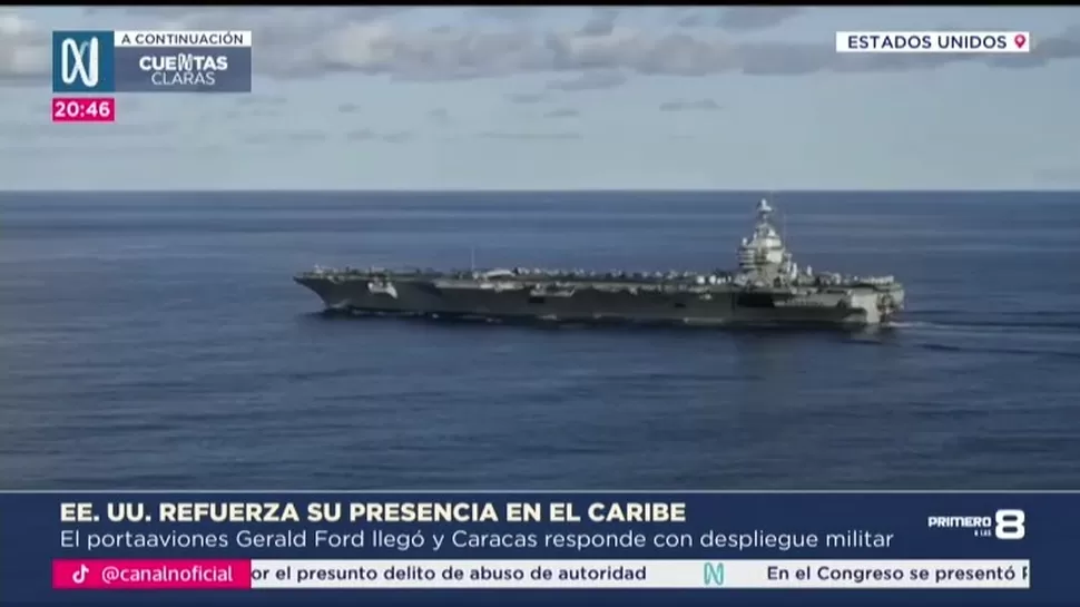 El USS Gerald Ford, considerado el portaviones más grande del mundo, se incorporó el martes al operativo militar que Estados Unidos mantiene desde septiembre contra el narcotráfico procedente de Latinoamérica. El despliegue ha sido cuestionado por Venezuela, que sostiene que su verdadero objetivo sería presionar o incluso derrocar al presidente Nicolás Maduro.
