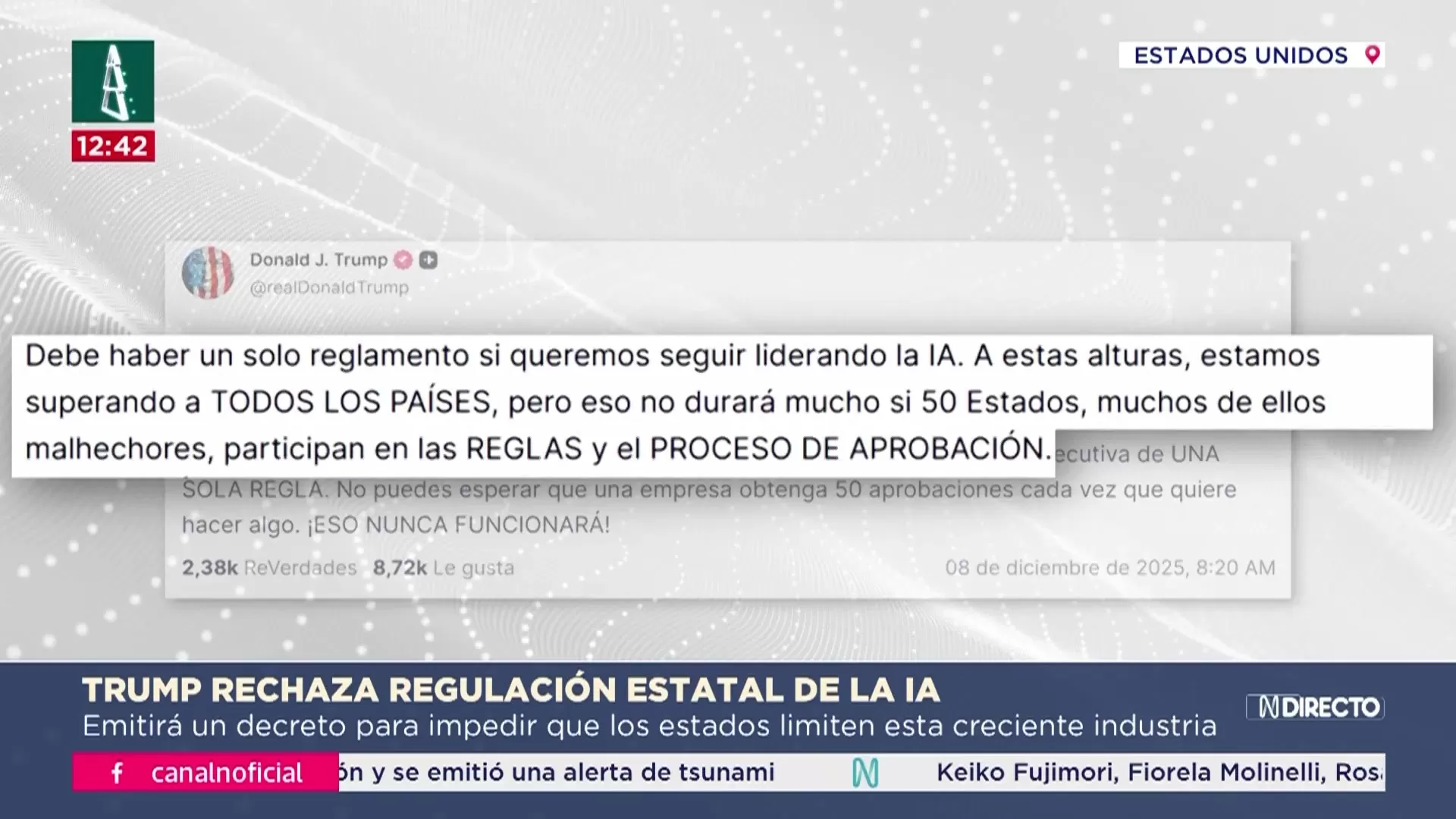 Trump aseguró en su red Truth Social que Estados Unidos está superando actualmente a todos los países, pero que esa ventaja podría perderse si los estados mantienen su capacidad de legislar. Consideró que muchos de ellos actúan como “malhechores” al interferir con procesos de aprobación tecnológica.