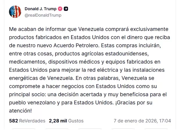 El presidente de Estados Unidos, Donald Trump, anunció que Venezuela comprará exclusivamente productos fabricados en EE.UU. utilizando los ingresos provenientes de un nuevo acuerdo petrolero bilateral. La información fue compartida por el propio mandatario en su cuenta personal de Truth Social este miércoles 7 de enero de 2026, en una publicación en la que también detalló el alcance de estas compras.