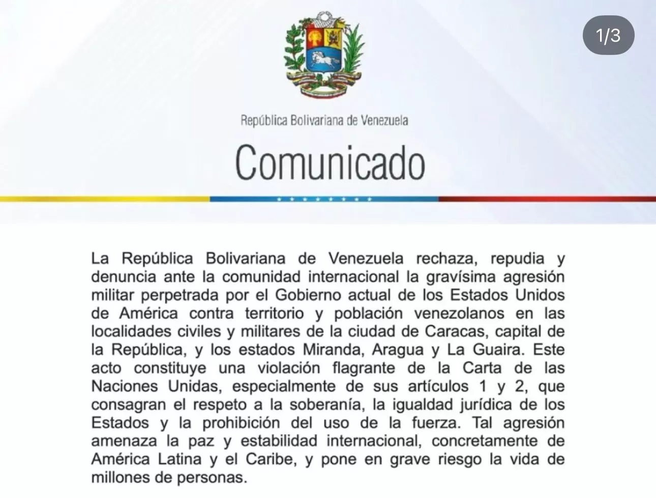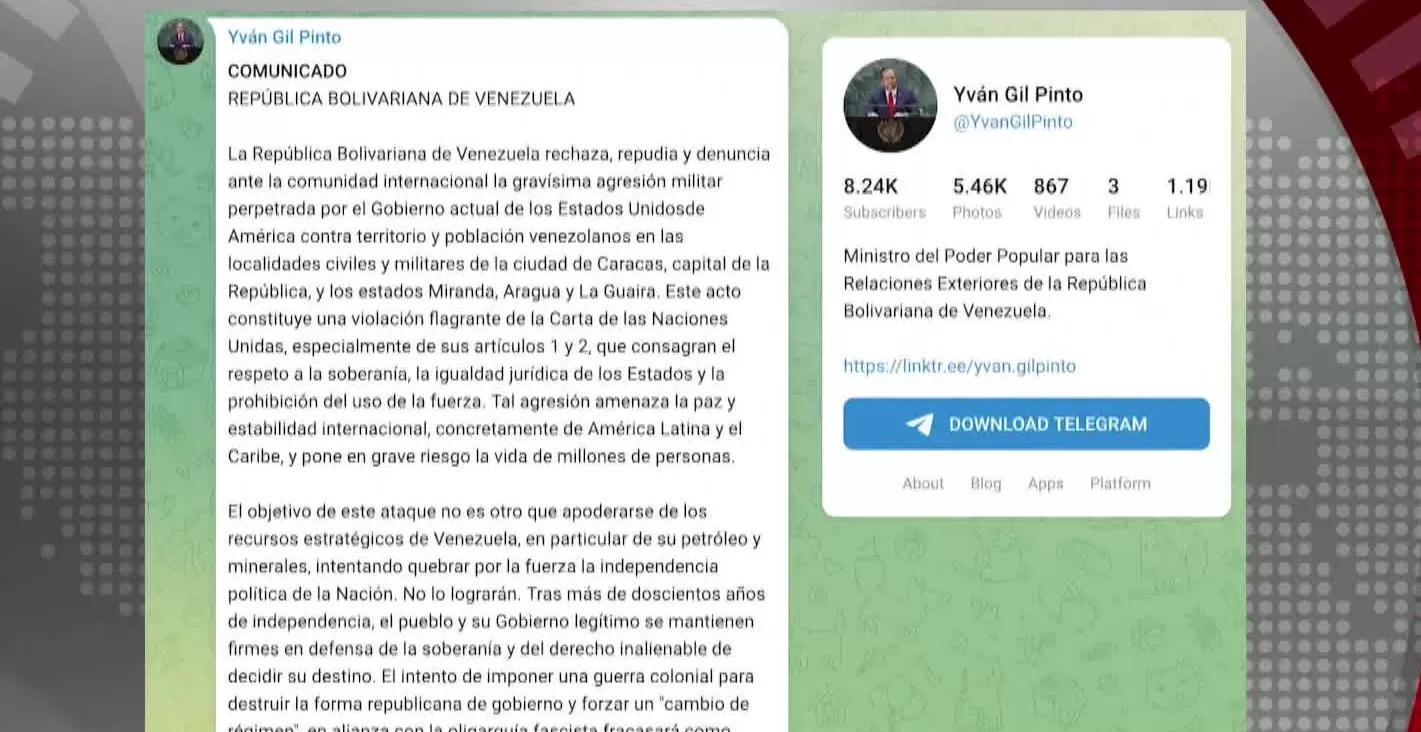 El canciller Yván Gil difundió un comunicado que denuncia una agresión militar de EE.UU. en Caracas y varios estados. Maduro firmó un decreto que declara el estado de Conmoción Exterior.