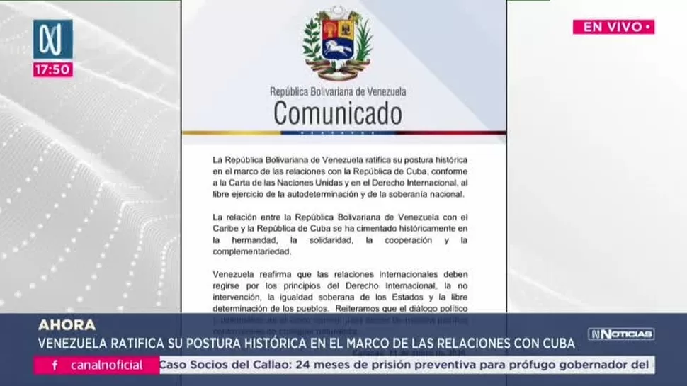 Venezuela emitió un comunicado donde reafirma sus lazos con Cuba y la importancia del diálogo pacífico según el derecho internacional