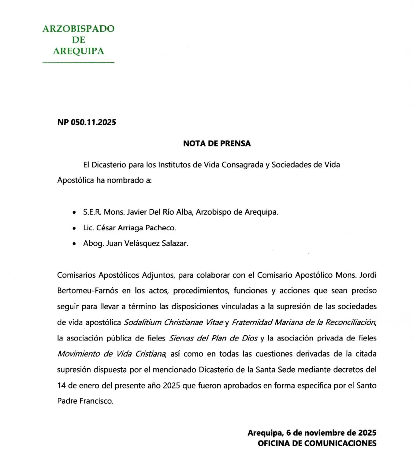 El Vaticano ha nombrado al arzobispo de Arequipa, monseñor Javier Del Río Alba, y a dos laicos peruanos como comisarios apostólicos adjuntos para colaborar en el proceso de supresión del Sodalicio de Vida Cristiana y otras comunidades vinculadas. Así lo informó el Arzobispado de Arequipa mediante un comunicado oficial.