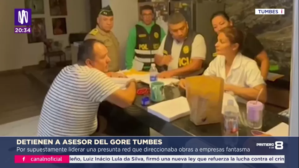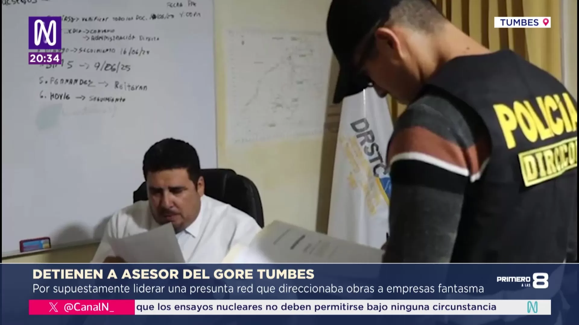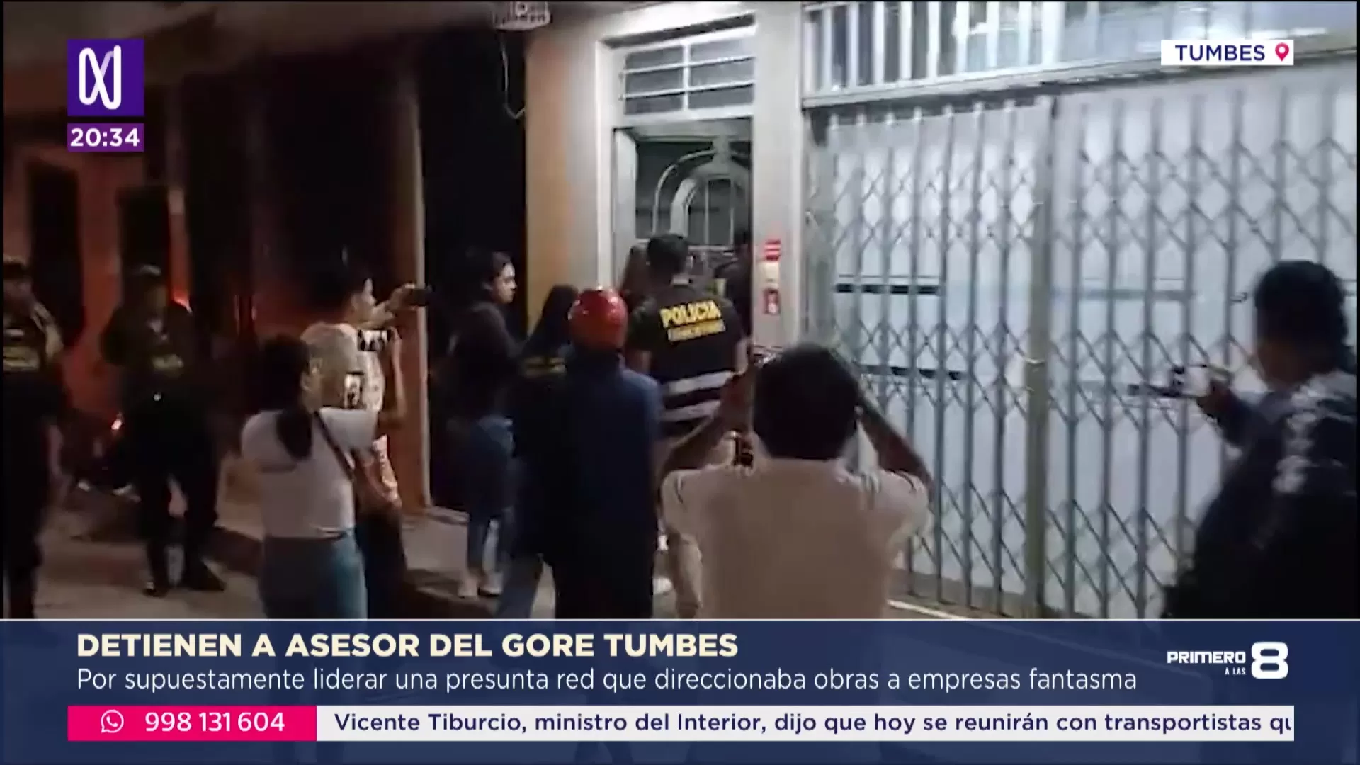 El asesor del Gobierno Regional de Tumbes, Nick Rojas Prescott, fue detenido en un megaoperativo policial por presuntamente liderar una red que direccionaba obras públicas a empresas de fachada. Siete personas fueron capturadas y once inmuebles allanados, incluida la sede de Transportes. El operativo fue ejecutado por la Policía Nacional y el Ministerio Público. Las investigaciones apuntan a una organización criminal activa desde 2022 que habría ocasionado un perjuicio de S/ 300,000 al Estado. También fue detenida la empleada del hogar del funcionario, Miriam Rojas García, quien figura como proveedora del Gobierno Regional de Tumbes.