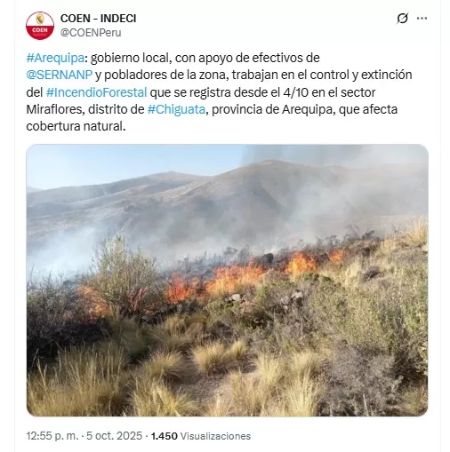 Un incendio forestal destruyó unas 50 hectáreas de pastizales en el distrito de Chiguata, región Arequipa. El fuego, iniciado el sábado 4 de octubre, fue controlado tras más de 24 horas de labores. Participaron brigadas del COER Arequipa, comuneros, personal del Sernanp y 30 soldados del Ejército del Perú. La alcaldesa Gladys Ticona indicó que el siniestro habría sido provocado por quemas agrícolas. No se registraron heridos ni viviendas afectadas. En lo que va del año, 1,300 hectáreas han sido destruidas por incendios en la región. Las autoridades pidieron evitar la quema de pastos.