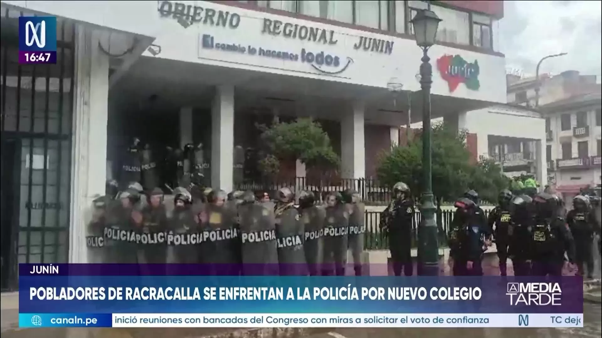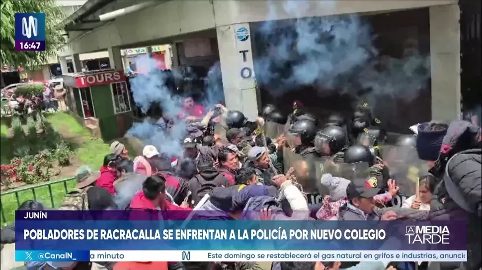 Pobladores del centro poblado de Racracalla, en el distrito de Comas, provincia de Concepción, se enfrentaron con agentes de la Policía Nacional en los exteriores del Gobierno Regional de Junín en Huancayo. Los comuneros llegaron para exigir la construcción de una nueva infraestructura para el colegio Jorge Chávez Dartnell. Durante la protesta se registraron empujones, lanzamiento de piedras y uso de bombas lacrimógenas, lo que provocó momentos de tensión y desmayos entre algunas manifestantes. Los pobladores señalaron que viajaron aproximadamente seis horas para participar en la movilización. Tras más de ocho horas de espera, lograron una comunicación telefónica con el gobernador Zósimo Cárdenas, quien acordó recibirlos la próxima semana.