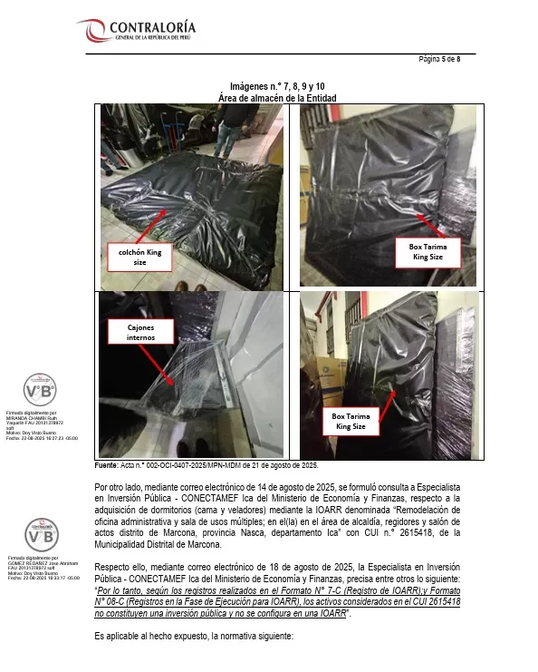 Durante la intervención en la municipalidad de Marcona, la Contraloría verificó físicamente la existencia de una cama King Size de tres plazas, junto con mobiliario de dormitorio adicional.