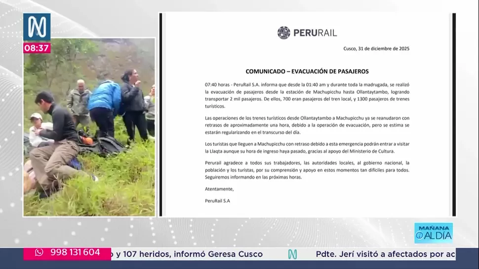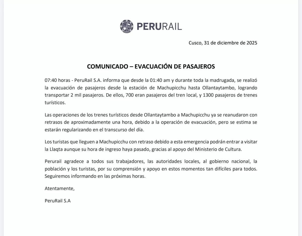 PeruRail S.A. informó este 31 de diciembre de 2025 que culminó con éxito la evacuación de pasajeros que se encontraban en la estación de Machu Picchu. La operación se ejecutó durante la madrugada para trasladar a los usuarios hacia Ollantaytambo tras una situación de emergencia.