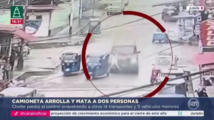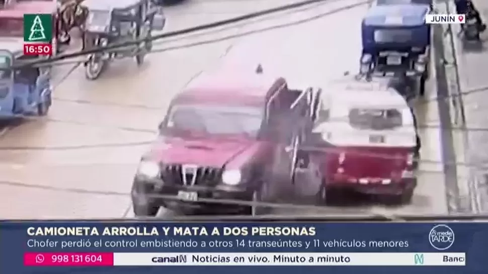 Dos personas murieron y otras catorce resultaron heridas tras un choque múltiple ocurrido en el distrito de Pichanaqui, región Junín. El incidente fue provocado por una camioneta que recorrió aproximadamente ocho cuadras sin detenerse, colisionando con varios vehículos menores, principalmente mototaxis. Las cámaras de seguridad de la zona captaron el recorrido descontrolado del vehículo, desde la calle Mariátegui hasta la Plaza de Armas de la ciudad.
