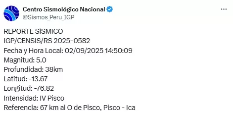 Un sismo de magnitud 5.0 se registró el martes a las 2:50 p.m. en la región de Ica, según informó el Centro Sismológico Nacional. El epicentro del movimiento telúrico se ubicó a 67 kilómetros al oeste de dicha ciudad, en la costa sur del Perú. El evento fue percibido también en Lima, aunque con menor intensidad.