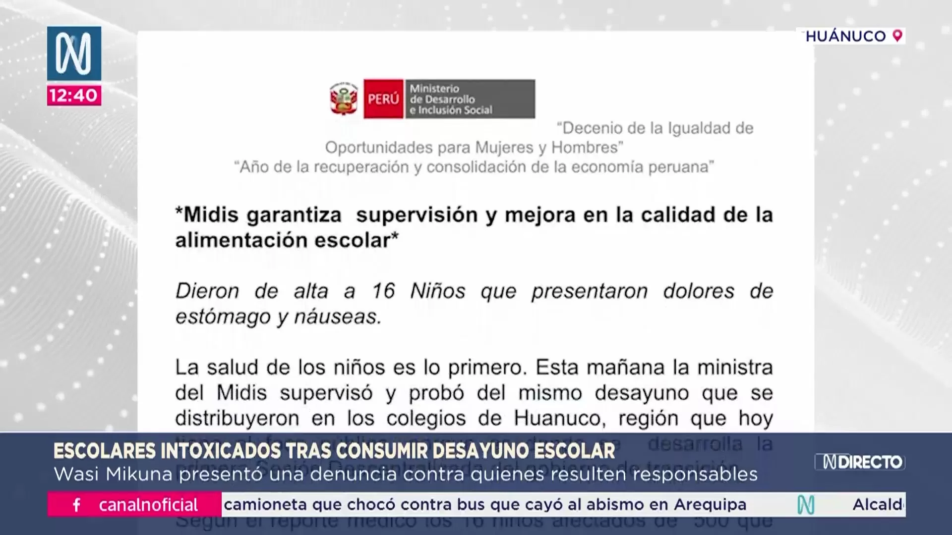 Dieciséis escolares del distrito de Amarilis, en Huánuco, resultaron intoxicados tras consumir un desayuno escolar distribuido por el programa Wasi Mikuna. Los estudiantes presentaron náuseas y dolor abdominal y fueron atendidos en el Hospital de Contingencia, donde fueron dados de alta. El Midis confirmó los hechos y anunció operativos de supervisión en centros educativos del país junto al Ministerio Público y la Contraloría. Autoridades regionales supervisaron la atención médica, y la Dirección Regional de Salud activó su plan de emergencia. Se recolectaron muestras de alimentos para análisis. El programa Wasi Mikuna se encuentra bajo revisión tras el incidente.