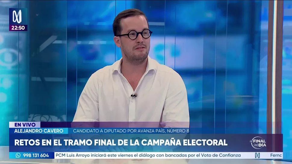 Al Final del DíaAlejandro Cavero: La campaña ha sido austera y con mucha convicciónAl Final del Día / Canal NAl Final del Día, de lunes a viernes a partir de las 10:00 p.m. por Canal N TagsAl Final del DíaRelacionadasMartha Moyano: El electorado toma decisiones en la colaDaniel Barragán: No tenemos ninguna relación, hasta el momento, con Vladimir CerrónRoberto Burneo: Todas las cédulas que se emiten en las mesas de sufragio se van a conservarFernando Rospigliosi: He dado una opinión en el ejercicio de mi funciónLos protagonistas en el último tramo de la campaña electoralSilvia Guevara: El voto preferencial es opcional
