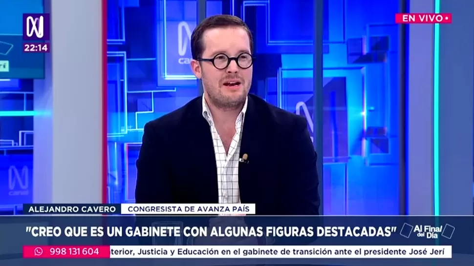Al Final del DíaAlejandro Cavero: Es un Gabinete con algunas figuras destacadas Al Final del Día / Canal NAl Final del Día, de lunes a viernes a partir de las 10:00 p.m. por Canal N Tagsal final del díaRelacionadasGastón Rodríguez: Es un acierto el nombramiento de Vicente TiburcioJavier Bedoya: No hay un cogobierno del PPC con el presidente JeríJuan Carlos Liendo: Conversación entre Fiscalía y PNP generaba un poco de alientoJosé Luna acusa a López Aliaga de apropiarse del partido de Castañeda Lossio Felipe James: Nos tomó por sorpresa la vacancia de BoluarteJaime de Althaus: Delia Espinoza es conflictiva
