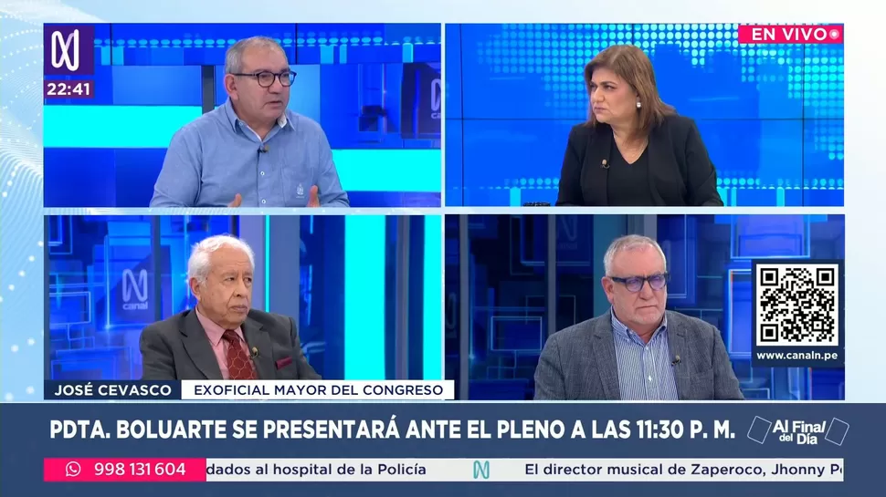 Al Final del DíaCevasco, Paredes Castro y Álvarez Rodrich analizan la vacancia de Dina BoluarteAl Final del DíaAl Final del Día, de lunes a viernes a partir de las 10:00 p.m. por Canal N Tagsal final del díaRelacionadasErick Urbina: Hoy es Butters, mañana otro candidato, estamos en desprotecciónEnrique Valderrama: Una de las grandes tareas del APRA será recuperar el sólido norteOtto Guibovich: Fueron impertinentes las declaraciones de la presidenta Boluarte sobre seguridadRoberto de la Tore: No pueden haber dos reuniones en jueves por el caso de los transportistasRicardo Burga: Hay una descoordinación total entre Ejecutivo y LegislativoKelly Portalatino: Boluarte no puede dar declaraciones vergonzosas