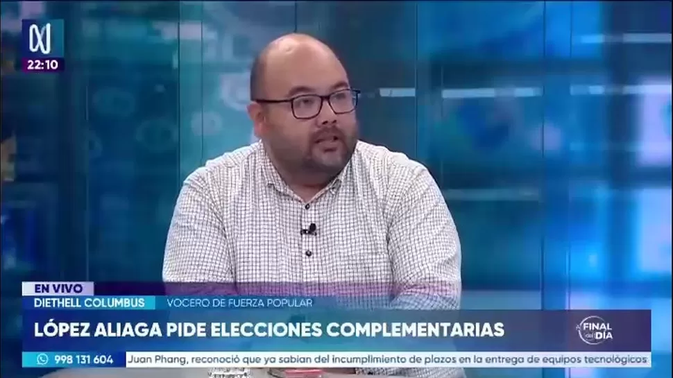 Al Final del DíaDiethell Columbus: No responderemos los impromptus de López Aliaga Al Final del Día / Canal NAl Final del Día, de lunes a viernes a partir de las 10:00 p.m. por Canal N TagsAl Final del DíaRelacionadasMario Amoretti Navarro: Existen diversos elementos que opacan la licitación de ONPEAlejandro Rospigliosi: El JNE debió fiscalizar la ONPEJorge Chávez Cresta:Delia Muñoz: Los plazos electorales no se modifican Wolfgang Grozo: Keiko Fujimori tendría que plegarse al pedido de nulidad de eleccionesJosé Cevasco: El Congreso dio el voto de confianza al gabinete Arroyo para no generar una crisis