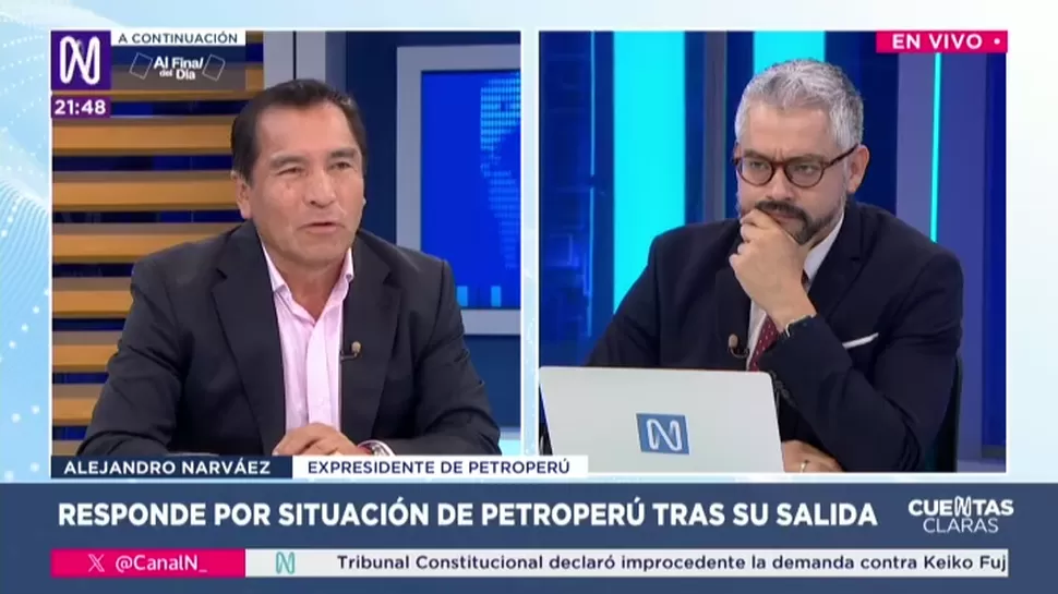 Cuentas ClarasAlejandro Narváez: Hemos estabilizado a PetroperúCuentas Claras / Canal NCuentas Claras, de lunes a viernes a partir de las 09:00 p.m. por Canal N TagsCuentas ClarasRelacionadasWilfredo Pedraza: El TC valientemente toma decisión correctaMiguel Torres: El fiscal Pérez debe salir a pedir perdónCarlos Herrera: Petroperú fue producto de una carga de favores políticos de distintos gobiernosCésar Nakazaki: La detención preliminar contra el policía es por el caso emblemáticoAlfredo Barnechea: El Perú no es una nación fallidaPNP: Policía disparó contra joven que murió en protesta