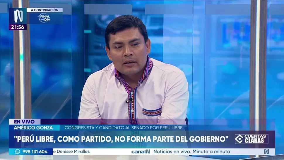 Cuentas ClarasAmérico Gonza: Perú Libre como partido no forma parte del GobiernoCuentas Claras / Canal NCuentas Claras, de lunes a viernes a partir de las 09:00 p.m. por Canal N TagsCuentas ClarasRelacionadasJuan Manuel Benites: El norte se podría poner peorJames Rodríguez: Hay posibles actos de corrupción en la PNP y Fiscalía en caso MarzanoJefferson Moreno: Mi tesis es de aceptación de fuga de Adrián VillarJonathan Cárdenas: Este calentamiento será por 3 trimestres consecutivosPatricia Juárez: Debe darse el voto de confianzaStefano Miranda: La Policía pidió la detención preliminar contra Adrián Villar