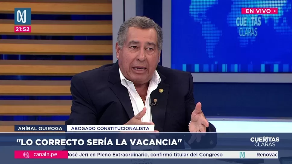 Cuentas ClarasAníbal Quiroga: Lo correcto sería la vacanciaCuentas Claras / Canal NCuentas Claras, de lunes a viernes a partir de las 09:00 p.m. por Canal N TagsCuentas ClarasRelacionadasColumbus: "Defender la estabilidad del país no es un tema de interés ni de cálculos"José Cueto sobre Jerí: "Se olvidó que es el encargado de la presidencia"Roberto Chiabra: El mismo José Jerí debería renunciarPatricia Juárez: La ultraderecha y los caviares se unenHugo de Zela: Tenemos que comer hamburguesa, chifa y un buen postreTeresa Mera Gómez: El Congreso ejerce su control político