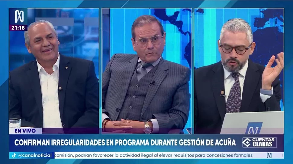 Cuentas ClarasConfirman irregularidades en programa durante gestión de AcuñaCuentas Claras / Canal NCuentas Claras, de lunes a viernes a partir de las 09:00 p.m. por Canal N TagsCuentas ClarasRelacionadasVíctor Gobitz: Cambio en la ley de minería es populismo puro y duroCluber Aliaga: La Policía debería explicar por qué no logra la ubicación de CerrónLuis Vivanco: Son argumentos políticos que lesionan el honor de Brunella HornaCarlos Mesía: El ministro Alfaro debe dar un paso al costadoSegundo Montalvo: Alfaro no merece estar en el cargo de ministroPedro Gamio: Petroperú ha perdido mercado y depende del apoyo estatal