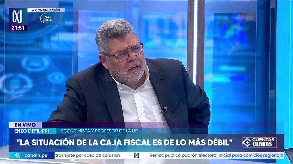 Cuentas ClarasEnzo Defilippi: La situación de la caja fiscal es lo más débilCuentas Claras / Canal NCuentas Claras, de lunes a viernes a partir de las 09:00 p.m. por Canal N TagsCuentas ClarasRelacionadasJosé Carlos Requena: Roberto Sánchez tendría mayor capacidad de movilización de personasCésar Nakazaki: Fue prematuro que JNE denunciara al exjefe de la ONPE, Piero CorvettoOtto Guibovich: Deberíamos ir a un peritaje informático y forenseJosé Tello: El daño del 12 de abril es irreversibleErnesto Álvarez: No creo que un ministro pueda actuar a espaldas del presidenteArturo Alegría: Nos quieren empujar a otra crisis con una moción de vacancia