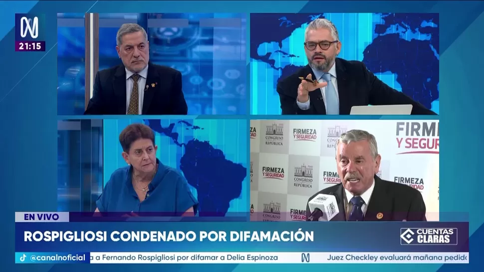 Cuentas ClarasFernando Rospigliosi fue condenado por difamaciónCuentas Claras / Canal NCuentas Claras, de lunes a viernes a partir de las 09:00 p.m. por Canal N TagsCuentas ClarasRelacionadasUrpi Torrado: A las 5 p. m. de este domingo 12 de abril se dará el flash electoral Iván Slocovich: Ricardo Belmont fue un mal alcalde de LimaErick Iriarte: El like no es un votoDiana Gonzales: En el próximo Congreso habría una bancada de la minería ilegalMartha Chávez: José Domingo Pérez debe ser castigadoJosé Carlos Requena sobre López Aliaga: "Tiene tendencia a pelearse con la gente, esto le está pasando factura"