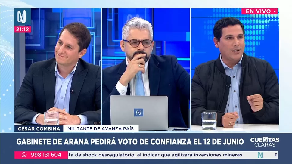 Cuentas ClarasGabinete Arana pedirá el voto de confianzar el 12 de junioCuentas Claras / Canal NCuentas Claras, de lunes a viernes a partir de las 09:00 p.m. por Canal N TagsCuentas ClarasRelacionadasFarid Kahhat: El plan de gobierno de Kast contempla la creación de un escudo fronterizo en los límites con Perú y BoliviaJulio Rodríguez: Existió delito contra la fe pública tras las presuntas irregularidades en elecciones internas de Acción PopularLuis Aragón: La decisión del JNE sobre Acción Popular es exageradaAlonso Roel: Hay que hacer un mea culpaPatricia Juárez: Hay mucha gente que tiene un antifujimorismo latenteAugusto Álvarez Rodrich: La elección pasada fue una ruleta