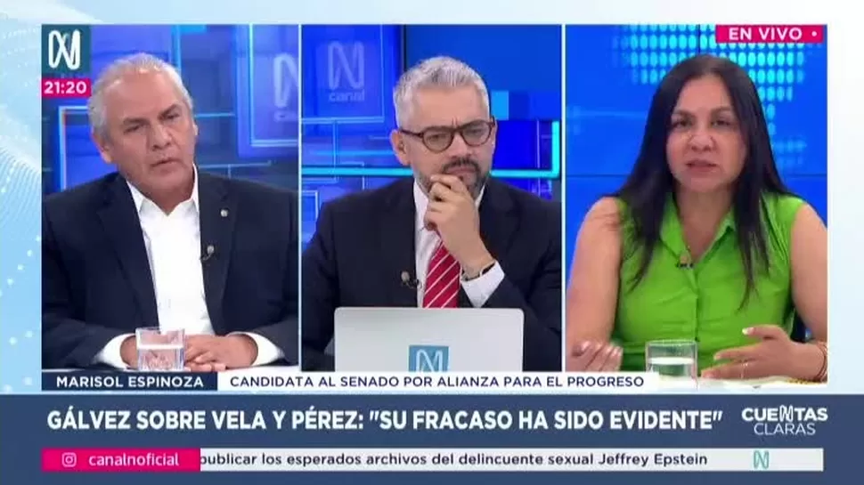 Cuentas ClarasGálvez se enfrenta a fiscales Vela y PérezCuentas Claras / Canal NCuentas Claras, de lunes a viernes a partir de las 09:00 p.m. por Canal N TagsCuentas ClarasRelacionadasJosé Baella: El sicariato existe porque no se regulan las armas en el paísJulio Espinoza: No hay posibilidad de hacer una interpretación en el caso CóctelesAlonso Segura: Son 17 leyes que afectan la caja fiscalJulio Chávez: Barnechea era a todas luces el beneficiado del fraudeIncidente durante firma del Pacto Ético ElectoralJanet Tapia: Las obras de los viaductos en la av. Javier Prado no cuentan con expedientes técnicos