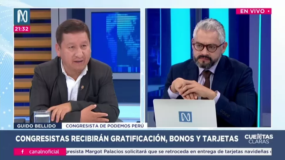 Cuentas ClarasGuido Bellido: Donaré mi bonificaciónCuentas Claras / Canal NCuentas Claras, de lunes a viernes a partir de las 09:00 p.m. por Canal N TagsCuentas ClarasRelacionadasFuad Khoury: El sueldo de un congresista es de S/15 600Denisse Miralles: Las elecciones están garantizadasGilbert Violeta: No creo que el video signifique que llevemos a CuevaRafael Rey: El Perú hoy está mejor dirigidoWalter Ayala: Si Castillo postula, puede ser el senador más votado del PerúRospigliosi respalda a la PNP ante manifestaciones
