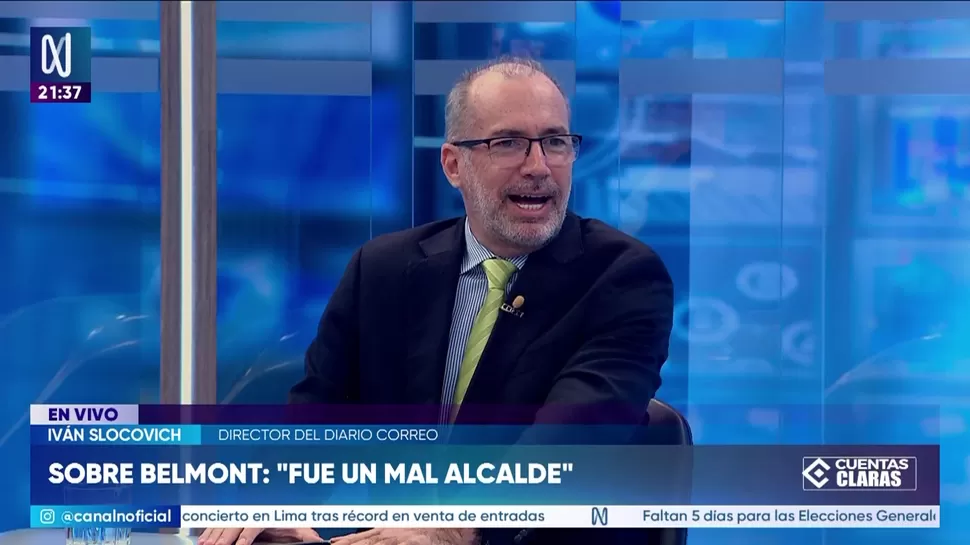 Cuentas ClarasIván Slocovich: Ricardo Belmont fue un mal alcalde de LimaCuentas Claras / Canal NCuentas Claras, de lunes a viernes a partir de las 09:00 p.m. por Canal N TagsCuentas ClarasRelacionadasUrpi Torrado: A las 5 p. m. de este domingo 12 de abril se dará el flash electoral Fernando Rospigliosi fue condenado por difamaciónErick Iriarte: El like no es un votoDiana Gonzales: En el próximo Congreso habría una bancada de la minería ilegalMartha Chávez: José Domingo Pérez debe ser castigadoJosé Carlos Requena sobre López Aliaga: "Tiene tendencia a pelearse con la gente, esto le está pasando factura"