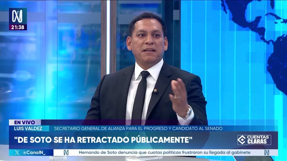 Cuentas ClarasLuis Valdez: Hernando de Soto nos daba cierta tranquilidadCuentas Claras / Canal NCuentas Claras, de lunes a viernes a partir de las 09:00 p.m. por Canal N TagsCuentas ClarasRelacionadasHernando de Soto: Siempre mantuve buena relación con AcuñaJorge Chávez Cresta: Prima el interés de permanecer en el poderHernando de Soto cuestiona al nuevo gabineteUrpi Torrado: Casi el 40% de peruanos no tiene posición políticaLourdes Alcorta: No me gusta De Soto como jefe de GabineteWolfgang Grozo: Estamos creciendo orgánicamente