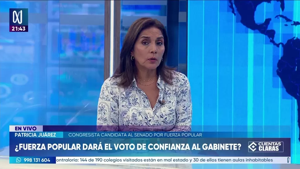 Cuentas ClarasPatricia Juárez: Debe darse el voto de confianzaCuentas Claras / Canal NCuentas Claras, de lunes a viernes a partir de las 09:00 p.m. por Canal N TagsCuentas ClarasRelacionadasStefano Miranda: La Policía pidió la detención preliminar contra Adrián VillarCarlos Caro: Pena por el caso Lizeth Marzano puede llegar a los 15 añosLuis Valdez: Hernando de Soto nos daba cierta tranquilidadHernando de Soto: Siempre mantuve buena relación con AcuñaJorge Chávez Cresta: Prima el interés de permanecer en el poderHernando de Soto cuestiona al nuevo gabinete