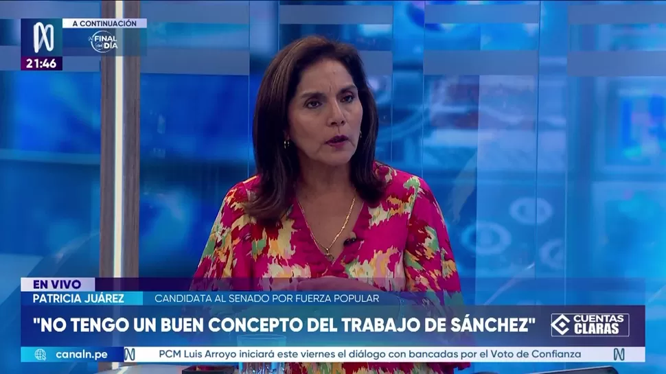 Cuentas ClarasPatricia Juárez: Jamás dijimos que el sistema electoral cometió fraudeCuentas Claras / Canal NCuentas Claras, de lunes a viernes a partir de las 09:00 p.m. por Canal N TagsCuentas ClarasRelacionadasElmer Cuba: Ahora, las crisis políticas se resuelven con la caída de un presidenteYehude Simon: Roberto Sánchez traicionó a Pedro Castillo Urpi Torrado: A las 5 p. m. de este domingo 12 de abril se dará el flash electoral Iván Slocovich: Ricardo Belmont fue un mal alcalde de LimaFernando Rospigliosi fue condenado por difamaciónErick Iriarte: El like no es un voto