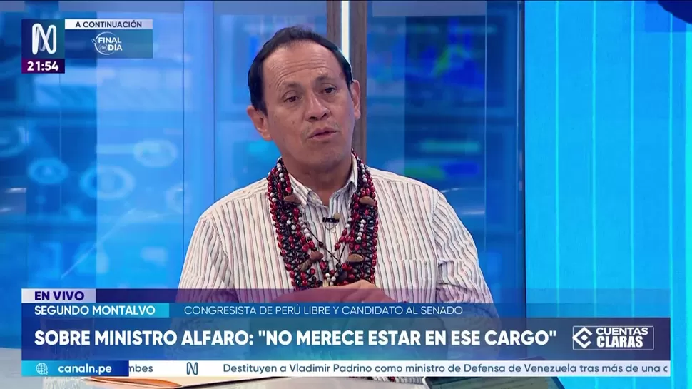 Cuentas ClarasSegundo Montalvo: Alfaro no merece estar en el cargo de ministroCuentas Claras / Canal NCuentas Claras, de lunes a viernes a partir de las 09:00 p.m. por Canal N TagsCuentas ClarasRelacionadasPedro Gamio: Petroperú ha perdido mercado y depende del apoyo estatalWalter Gutiérrez: Salida de Miralles evidencia disputas por ministeriosMiralles deja la PCM a un día del voto de confianzaAlejandro Daly: El Perú no está creciendo al ritmo que le permita captar a los 300 mil jóvenesJeffrey Radzinsky: La población carece de un ánimo electoral para los comicios 2026Ramiro Escobar: Construcción de muros y zanjas en la frontera norte de Chile podría provocar una nueva crisis migratoria