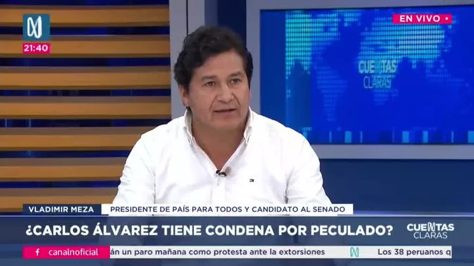 Cuentas ClarasVladimir Meza: La máxima instancia absolvió a Carlos ÁlvarezCuentas Claras / Canal NCuentas Claras, de lunes a viernes a partir de las 09:00 p.m. por Canal N TagsCuentas ClarasRelacionadasHenry Shimabukuro: A mí me llama Nicanor Boluarte en eneroInvestigarán reunión del presidente Jerí con empresario chinoUrpi Torrado: Indecisos bajaron de 50% a 43%, esos puntos se están repartiendo entre principales candidatosJosé Jerí usa el "cofre" para reunión no registradaRonald Atencio: No pertenezco a ninguna organización criminalJosé Naupari: En el caso de López Chau ni hubo sentencia