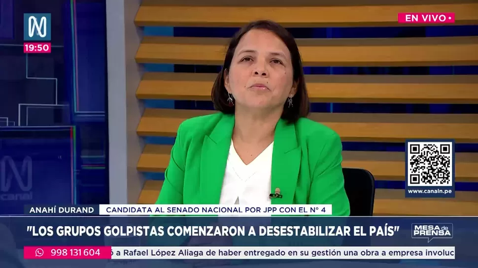 Anahí Durand, candidata al Senado por Juntos por el Perú, defendió su rol en el gobierno de Pedro Castillo y calificó su destitución como producto de un complot político. Propuso mecanismos como la muerte cruzada para restablecer el equilibrio de poderes y presentó iniciativas para enfrentar la inseguridad ciudadana y alimentaria. Cuestionó al Congreso, al modelo agroexportador y al presidente José Jerí, al tiempo que pidió revisar las exoneraciones tributarias. Afirmó representar un proyecto popular más allá de ideologías y aseguró estar comprometida con una fiscalización electoral rigurosa