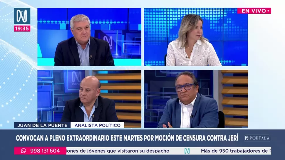 N PortadaConvocan a pleno extraordinario este martes por moción de censura contra JeríN Portada / Canal NN Portada, de lunes a viernes a partir de las 07:00 p.m. por Canal N TagsN PortadaRelacionadasJorge Nieto: Jerí no tenía las condicionesPlanes de Gobierno: propuestas sobre seguridad ciudadanaSegundo Montalvo: Hay siete mociones de censuraMiguel Torres: La vacancia no es un camino que deba darseVíctor Andrés García Belaunde: Creo que Jerí debe ser vacadoNatale Amprimo: Lo que corresponde es que vaquen a José Jerí