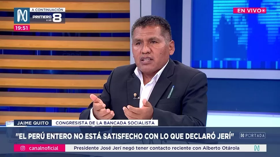 N PortadaJaime Quito: El Perú entero no está satisfecho con lo declarado por JeríN Portada / Canal NN Portada, de lunes a viernes a partir de las 07:00 p.m. por Canal N TagsN PortadaRelacionadasRemigio Hernani: Pese a los esfuerzos del Gobierno, los resultados en seguridad aún no muestran una mejora significativaCarlos Neuhaus: Yo creo que Jerí no debe ser retirado del GobiernoErnesto Blume: Son lamentables los hechos que involucran al presidente José Jerí Roberto Vieira: Es prudente que el presidente José Jerí renuncie al cargoIván Slocovich: Jerí ha hecho todos los méritos para que lo botenJosé Cueto: Jerí debería tener un grado de reflexión de lo que está haciendo