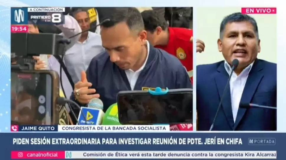N PortadaJaime Quito: Reunión entre Jerí y empresario chino genera sospechasN Portada / Canal NN Portada, de lunes a viernes a partir de las 07:00 p.m. por Canal N TagsN PortadaRelacionadasMartín Ojeda: Estamos hablando de un paro del 100% de la flota del transporte urbanoGuillermo Aliaga: José Jerí hace un mea culpaTito Alegría: Machu Picchu es un legado, no un botínEnzo Elguera: López Chau tiene todo el derecho a participarMarisol Pérez Tello: El JNE ha asumido su responsabilidadLuis Nunes: Yo creo que van a entrar por Diosdado Cabello