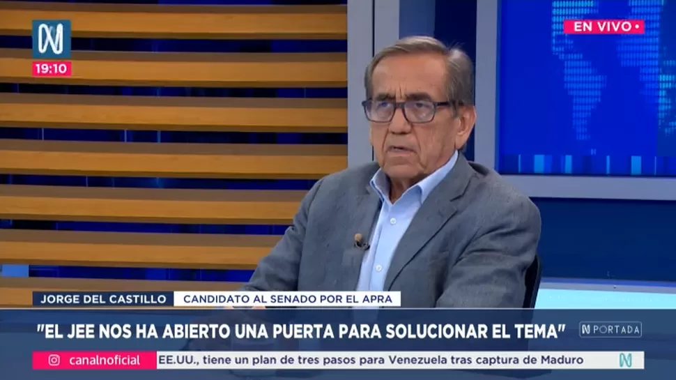 N PortadaJorge del Castillo: Nunca estuvo previsto llevar invitados en el APRAN Portada / Canal NN Portada, de lunes a viernes a partir de las 07:00 p.m. por Canal N TagsN PortadaRelacionadasLuis Nunes: Yo creo que van a entrar por Diosdado CabelloJulio Campos: Realizaremos una asamblea el martesHéctor Valer: Fue una conducta muy reprochable y recurrente la de Kira AlcarrazVíctor García Toma: No es posible un amparo en el caso de Acción PopularLuis Miguel Castilla: Después de mucho tiempo veo un MEF firmeAriel Segal: Diosdado Cabello es quien maneja a los colectivos