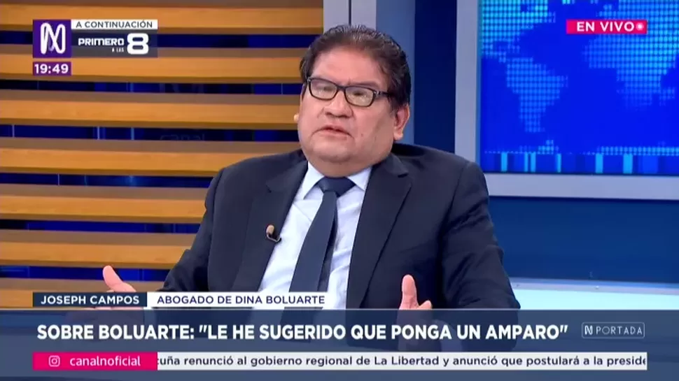 N PortadaJoseph Campos: Le he sugerido a Dina Boluarte que ponga un amparoN Portada / Canal NN Portada, de lunes a viernes a partir de las 07:00 p.m. por Canal N TagsN PortadaRelacionadasJosé Carlos Requena: El mayor riesgo es terminar como MerinoLuis Valdez: APP siempre apoyará la gobernabilidadEnrique Ghersi: La mayoría en el TC se ha pronunciado a favor de Keiko FujimoriMarisol Pérez Tello: Yo no integraría el gabinete de José JeríHernán Chaparro: El país vive un clima enrarecido y de cansancio socialDomingo García Belaunde: Los ministros se quedan para entregar el cargo