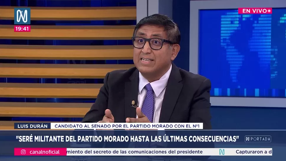 N PortadaLuis Durán: Seré militante del partido Morado hasta las últimas consecuenciasN Portada / Canal NN Portada, de lunes a viernes a partir de las 07:00 p.m. por Canal N TagsN PortadaRelacionadasCecilia Chacón: El Senado va a tener una función sumamente importante Pedro Gamio: No se pueden hacer las cosas bien sin convocar al mejor equipoOmar Quesada: Hay falta de humildad para gobernar el paísRicardo Caldas: José Jerí no fue a una reunión, fue a Market Capón a comprarCarlos Tubino: El Perú no puede seguir viviendo en la inestabilidadJorge Marticorena: No convenció la presentación de Jerí en el Congreso